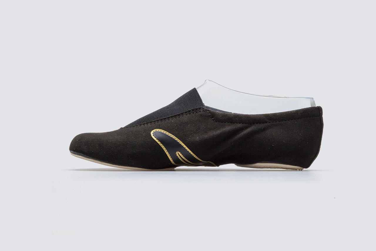 Oryginalne baletki sportowe, gimnastyczne, sneakersy do codziennych treningów, zajęć marki IWA GIMNASTICS model 507 w eleganckim czarnym kolorze. Wykonane z welurowego materiału wierzchniego najwyższej jakości. Mają czarne paski i złote, ozdobne wstawki kolorystyczne. Obecność loga potwierdza autentyczność obuwia. Kupisz je w rozmiarach 31-47, dzięki czemu odpowiednie są dla dzieci oraz dorosłych.