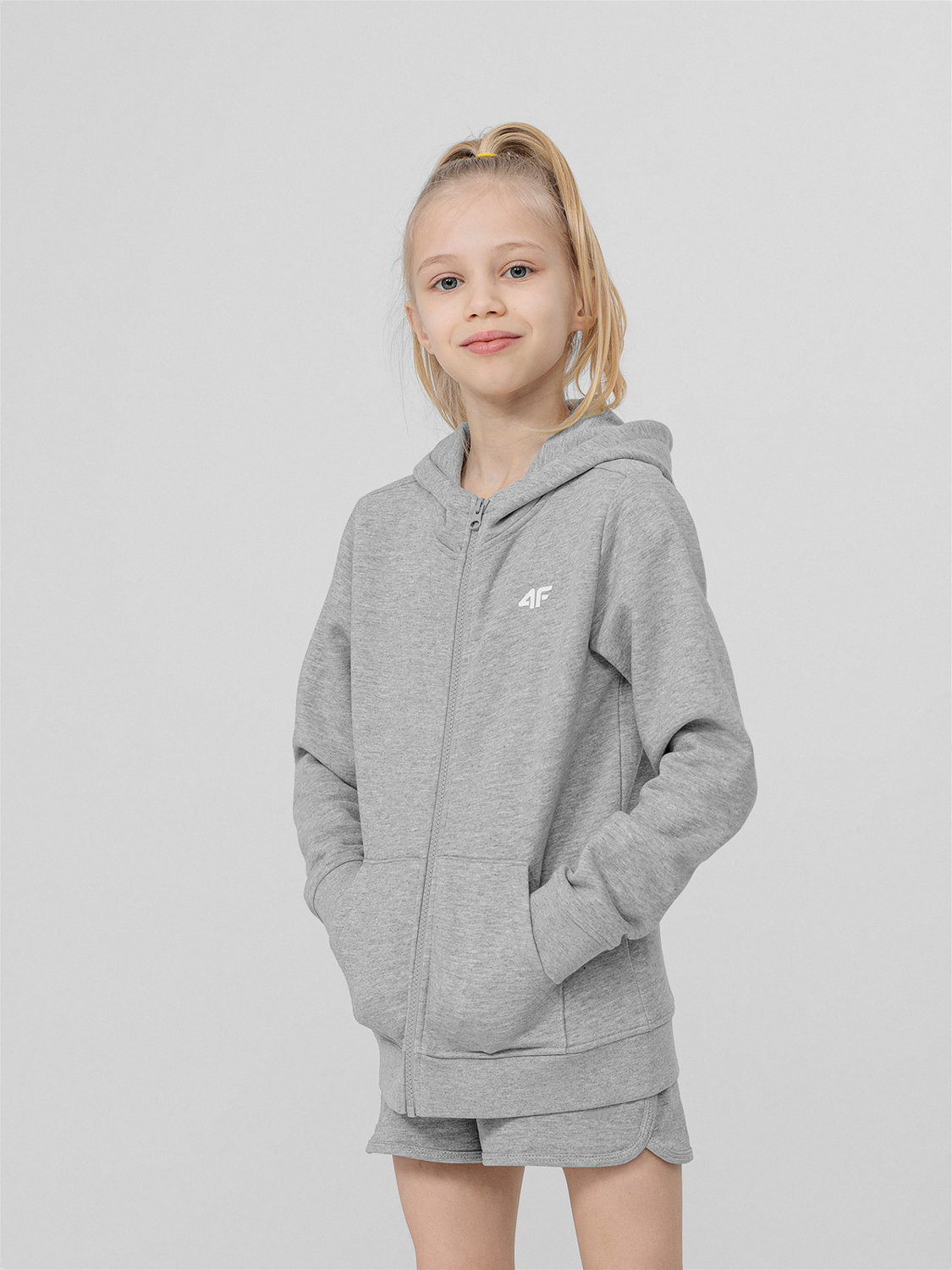 Dziewczęca rozpinana bluza dresowa z kapturem marki 4F. Zapinana na zamek, świetnie sprawdzi się w okresie przejściowym. Wyposażona została również w zintegrowany kaptur, który dodatkowo chroni przed chłodem. Posiada dwie kieszenie boczne, dając możliwość noszenia przy sobie nawet najmniejszych drobiazgów.