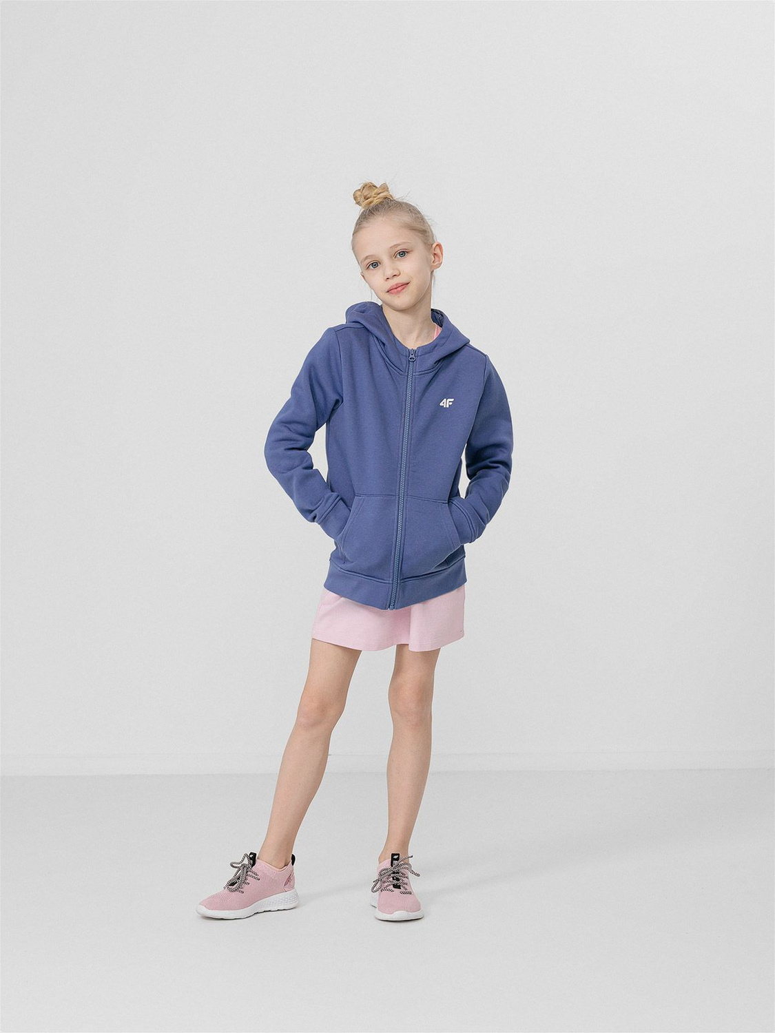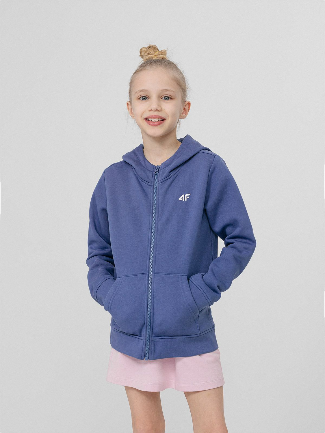 Dziewczęca rozpinana bluza dresowa z kapturem marki 4F. Zapinana na zamek, świetnie sprawdzi się w okresie przejściowym. Wyposażona została również w zintegrowany kaptur, który dodatkowo chroni przed chłodem. Posiada dwie kieszenie boczne, dając możliwość noszenia przy sobie nawet najmniejszych drobiazgów.