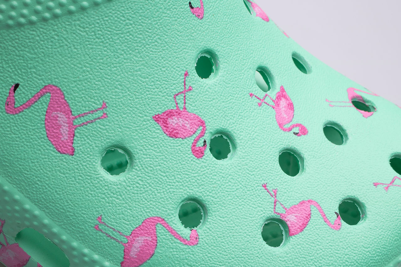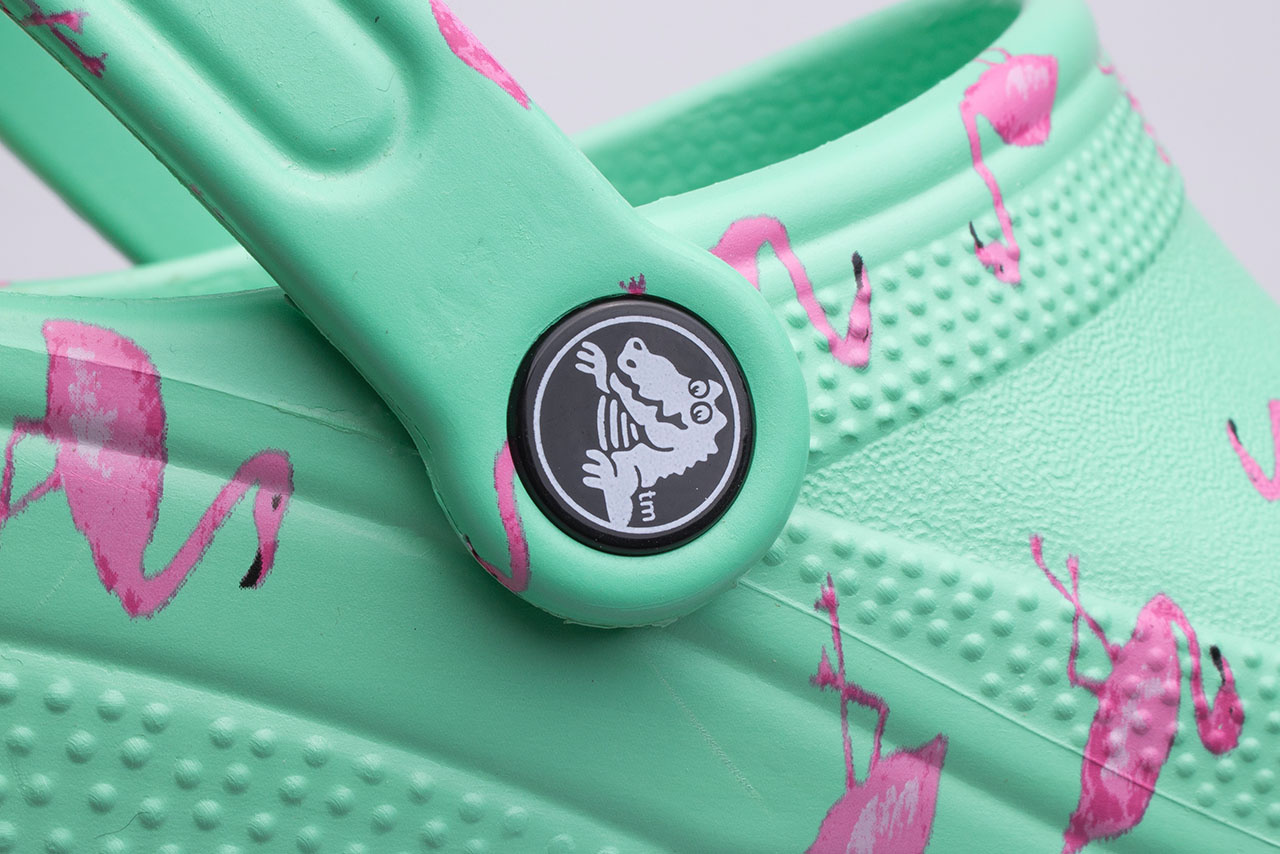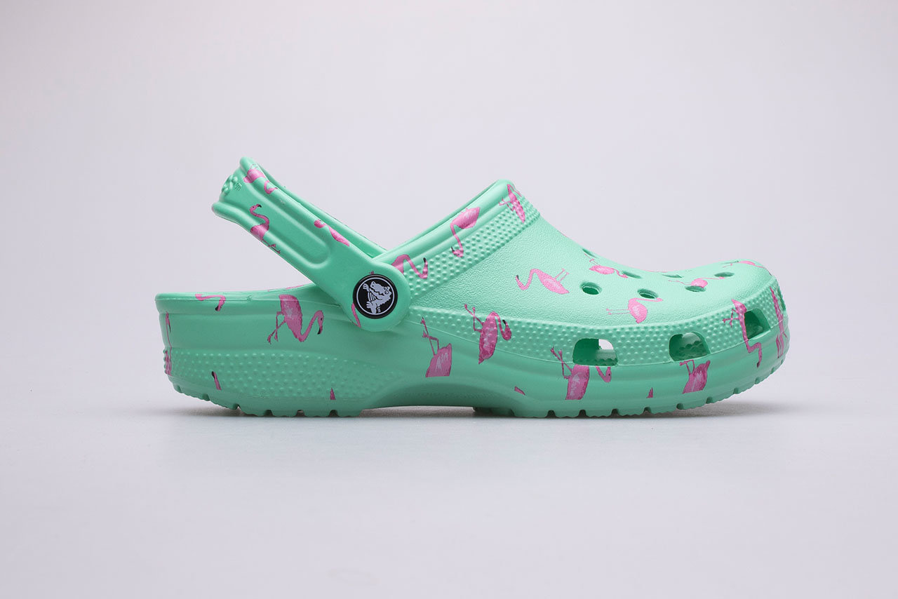 Klapki damskie Crocs Vacay Wibes Clog Flamingo 206375-6S0 w kolorze zielonym z najmodniejszym wzorem w różowe flamingi. Wykonane ze specjalnego materiału - croslite, który nie odparza stóp, buty nie przechodząc zapachem, są łatwe w myciu – wystarczy woda z mydłem i niezwykle lekkie oraz elastyczne.