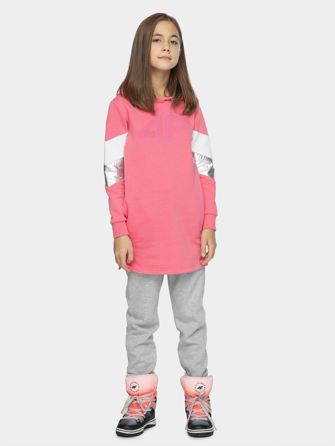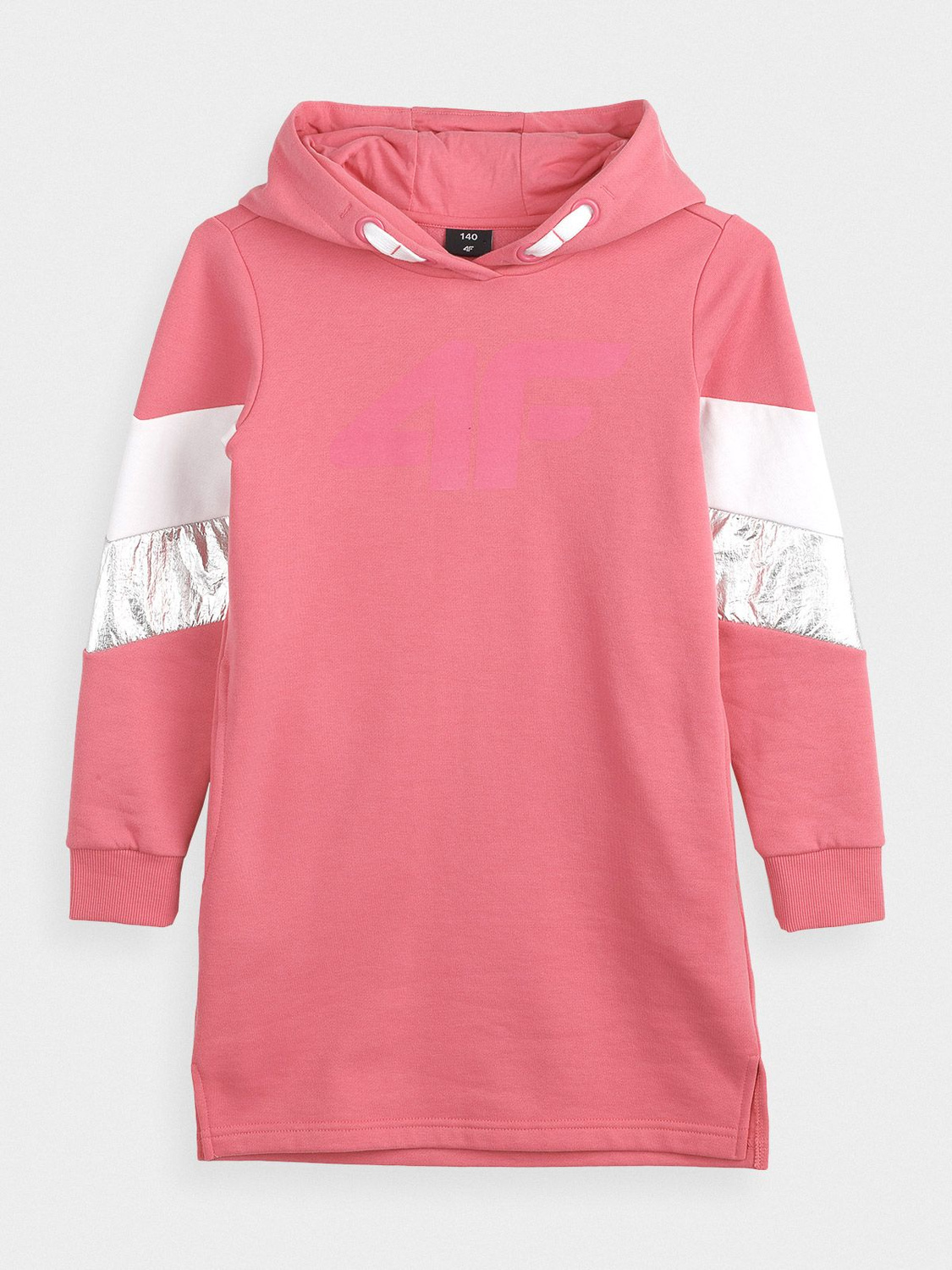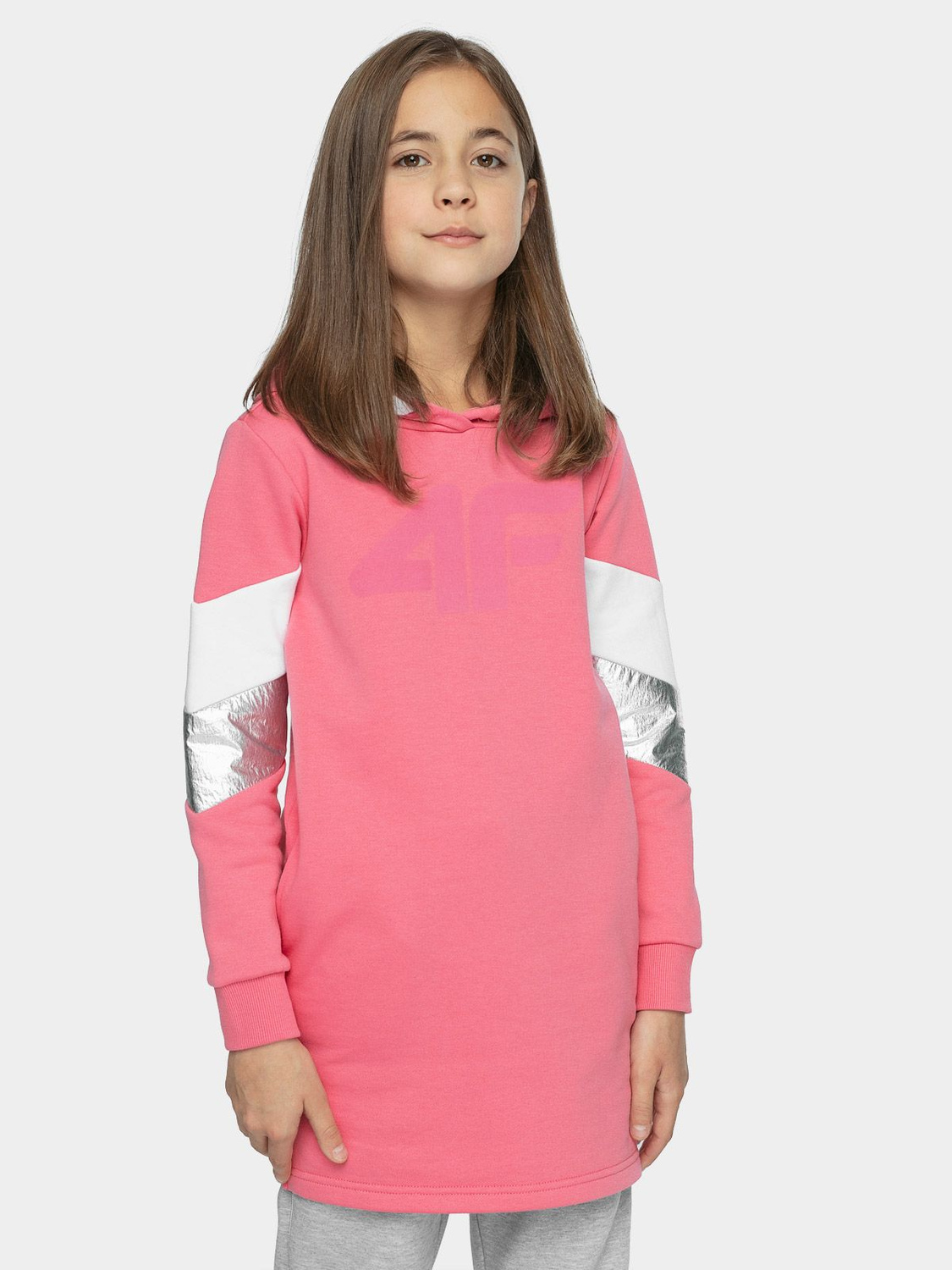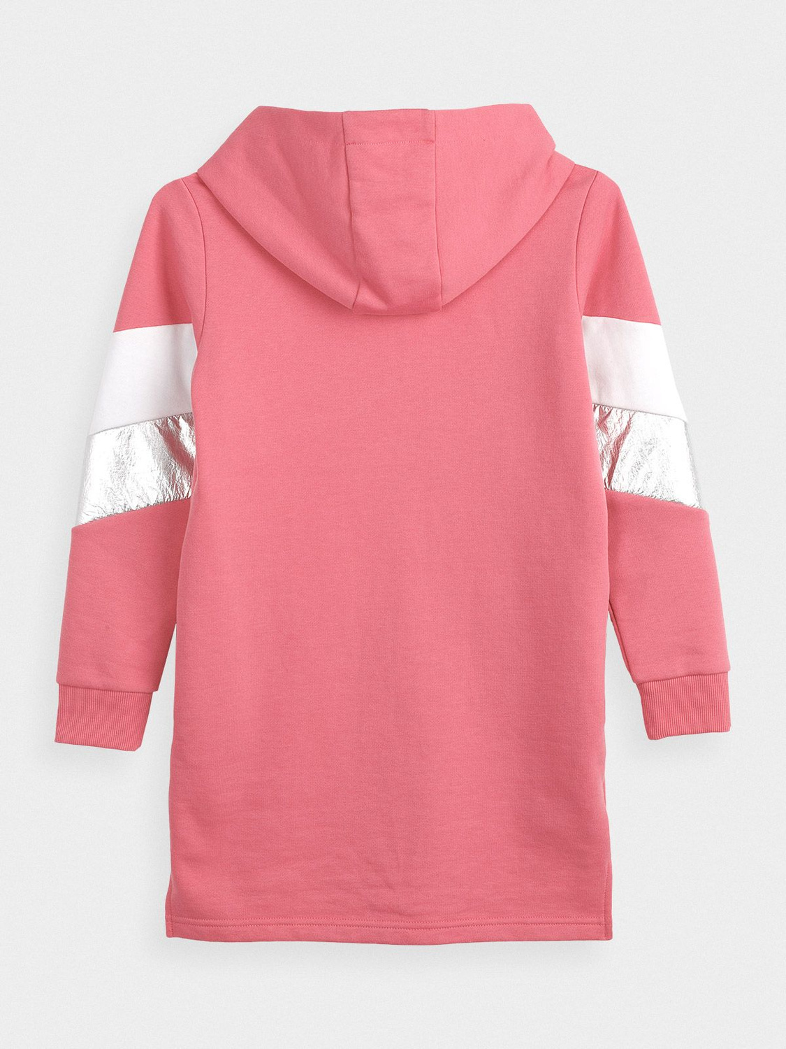 Wygodna dresowa sukienka z kapturem, ocieplana od wewnątrz. Przeznaczona dla dziewcząt zapewni komfort w codziennym użytkowaniu. Dwustronny kaptur zapewnia dodatkową ochronę głowie. Mankiety zakończone ściągaczami, pozwolą na regulowanie długości rękawa nie ograniczając przy tym ruchów. Sukienka posiada dwie otwarte kieszenie po bokach.